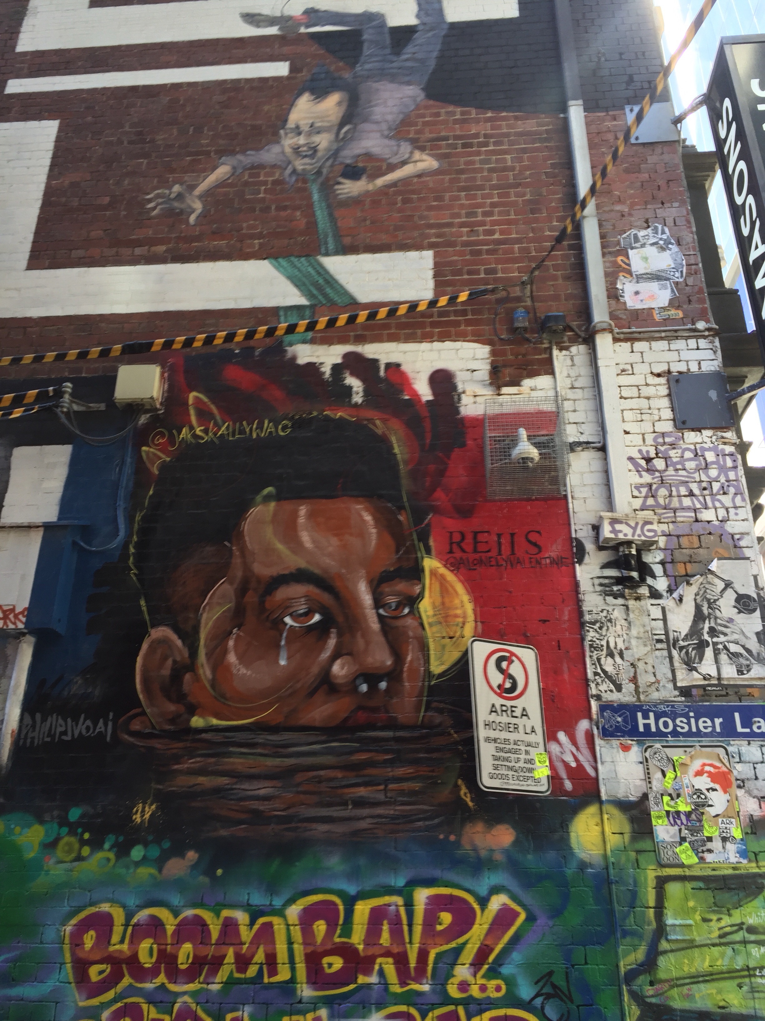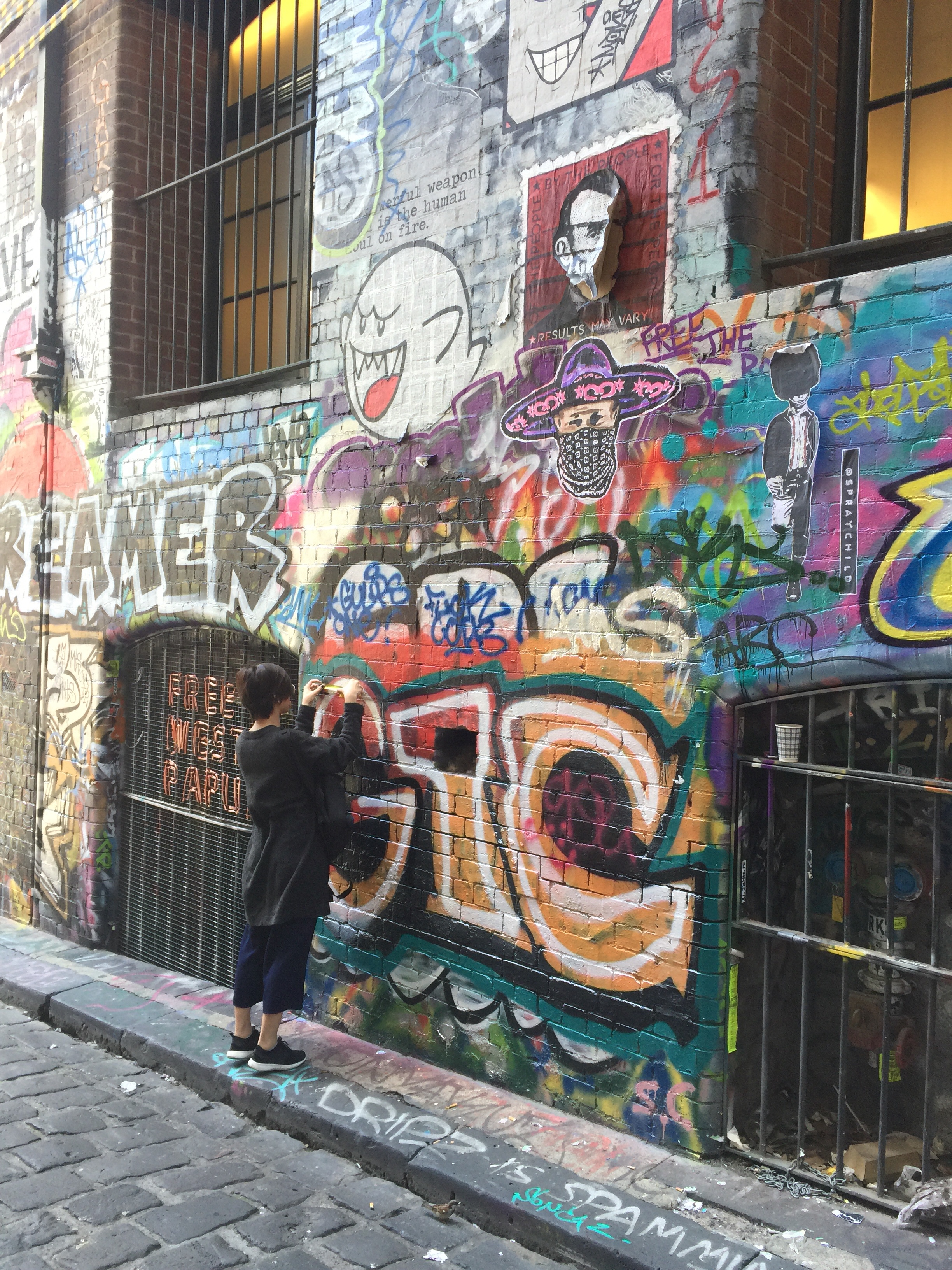 Lovely surprise. The dizzying array of colours, characters and creative shapes, Hosier Lane is like the canvas of the city or the whole nation. It attracts the artists around the globe, I watched a girl studied the paints carefully even used the ruler for measurements. The lady works at Movida – one of city’s best tapa restaurants sitting in the outside chair for a cigarette, and she somehow contrarily immersed into this colourful mayhem of the street art.